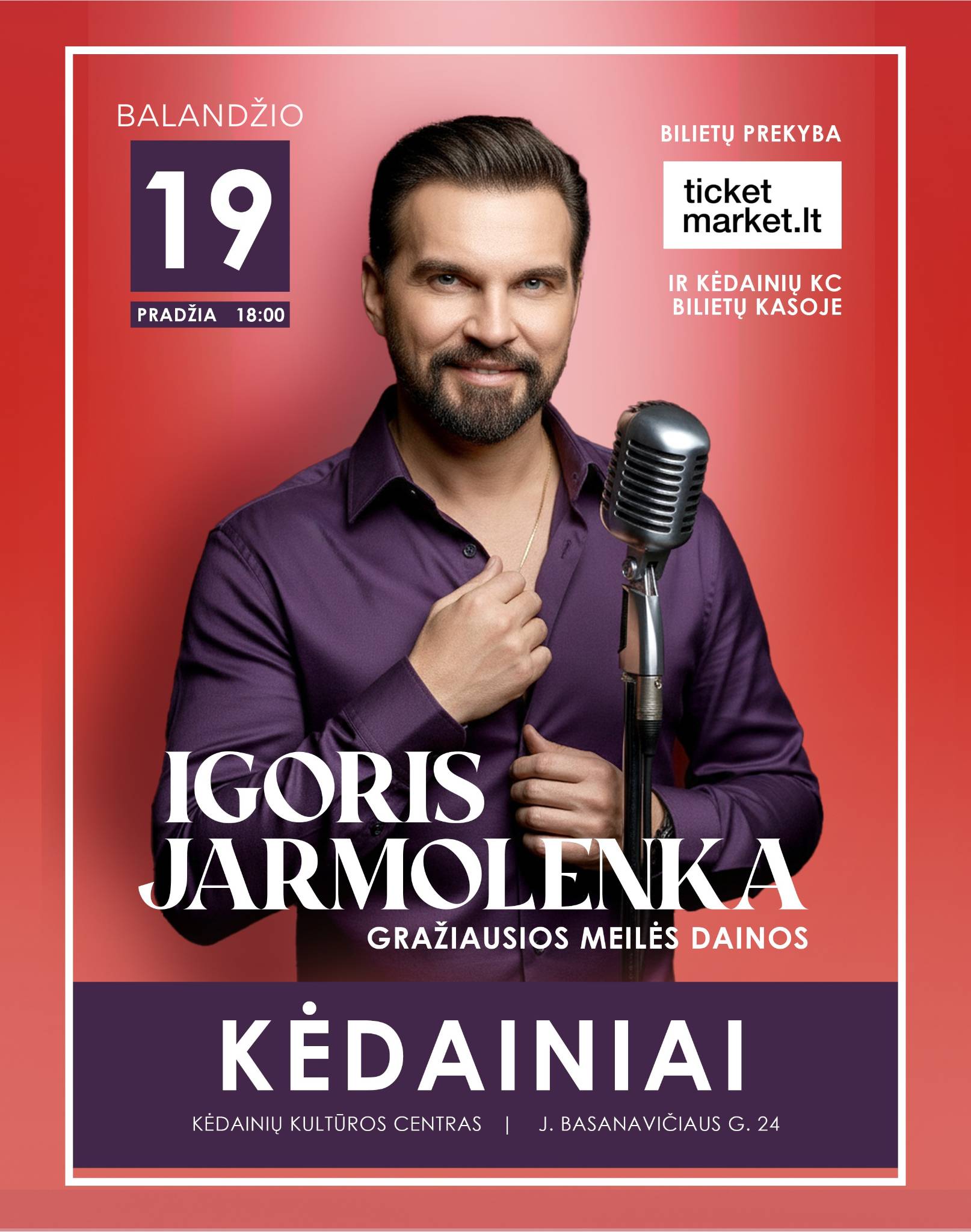 Igoris Jarmolenka – vienas karščiausių Lietuvos estrados balsų, žinomas dėl savo ypatingos charizmos ir nepakartojamo balso tembro. Šį vakarą laukia įspūdinga muzikinė kelionė per gražiausias meilės dainas, kurios palies kiekvieną klausytoją.